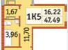 1 кімната , площа 47.49 / 16.22 / 12.45 , поверх 16